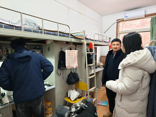 检查过程中,董丙剑一行逐楼层、逐寝室开展细致排查,重点检查宿舍用电安全、内务卫生及违禁违规电器使用情况,指出现场发现的不规范用电、杂物堆放和宿舍门禁隐患等问题,明确整改要求,将安全隐患消除在萌芽状态。同时,现场开展了安全宣教,强调假期返家报备、交通出行等注意事项,引导学生牢固树立安全第一的意识,自觉遵守宿舍管理规定,共同维护安全有序的住宿环境。