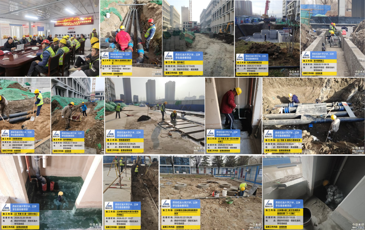 春节期间,鄠邑校区21、22号宿舍楼项目施工现场持续施工,全体参建人员秉持高度责任感与使命感,坚守施工一线。施工及监理单位一线人员放弃春节假期与家人团聚的机会,以建设目标为导向,协同推进工程进度。假期期间,重点完成室内防水施工作业、自然层装饰装修与室内水电安装工程、室外管网铺设、化粪池施工、屋面防水及发泡混凝土铺设等关键任务,以实际行动诠释责任担当,确保建设工期稳步推进。