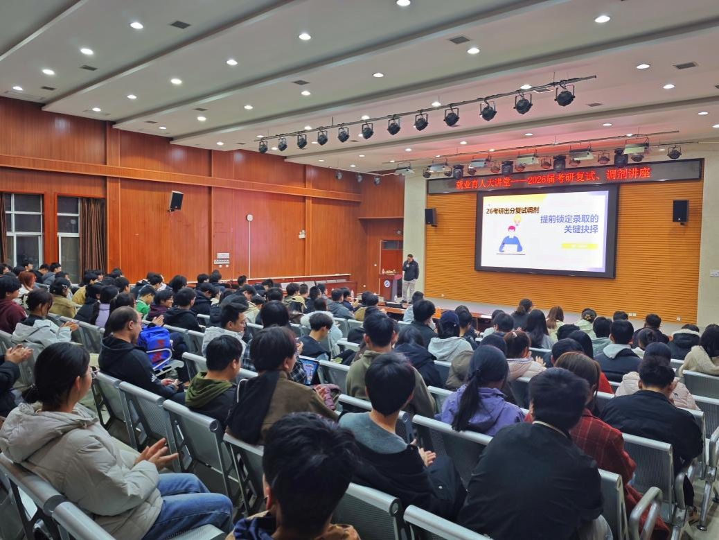 就业创业指导中心在鄠邑校区崇文楼118报告厅开展“就业育人大讲堂”《2026届考研复试与调剂》专题讲座。此次讲座特邀北京研思教育红星老师担任主讲,来自全校各院(系)的200余名考研学子现场参加。