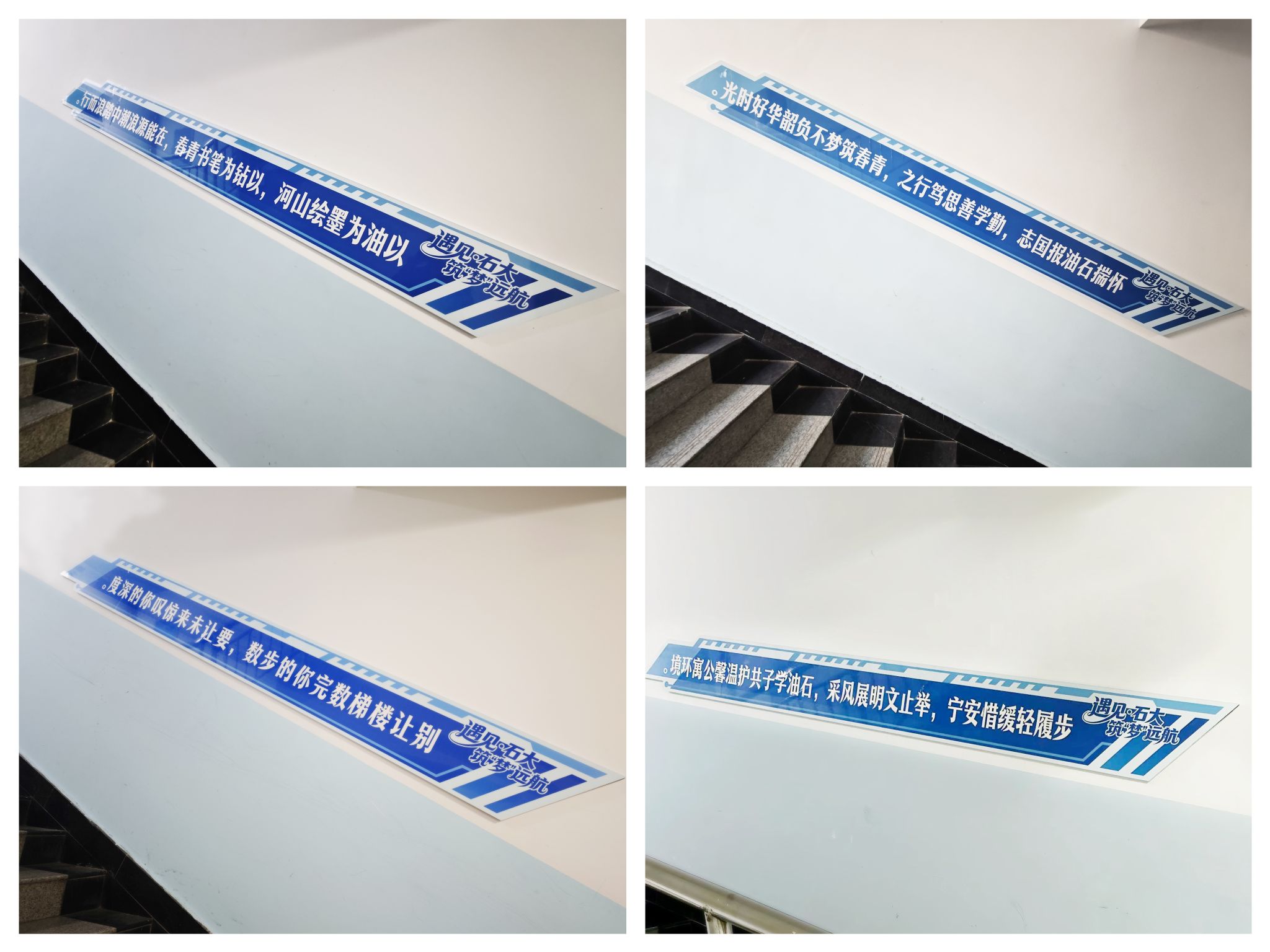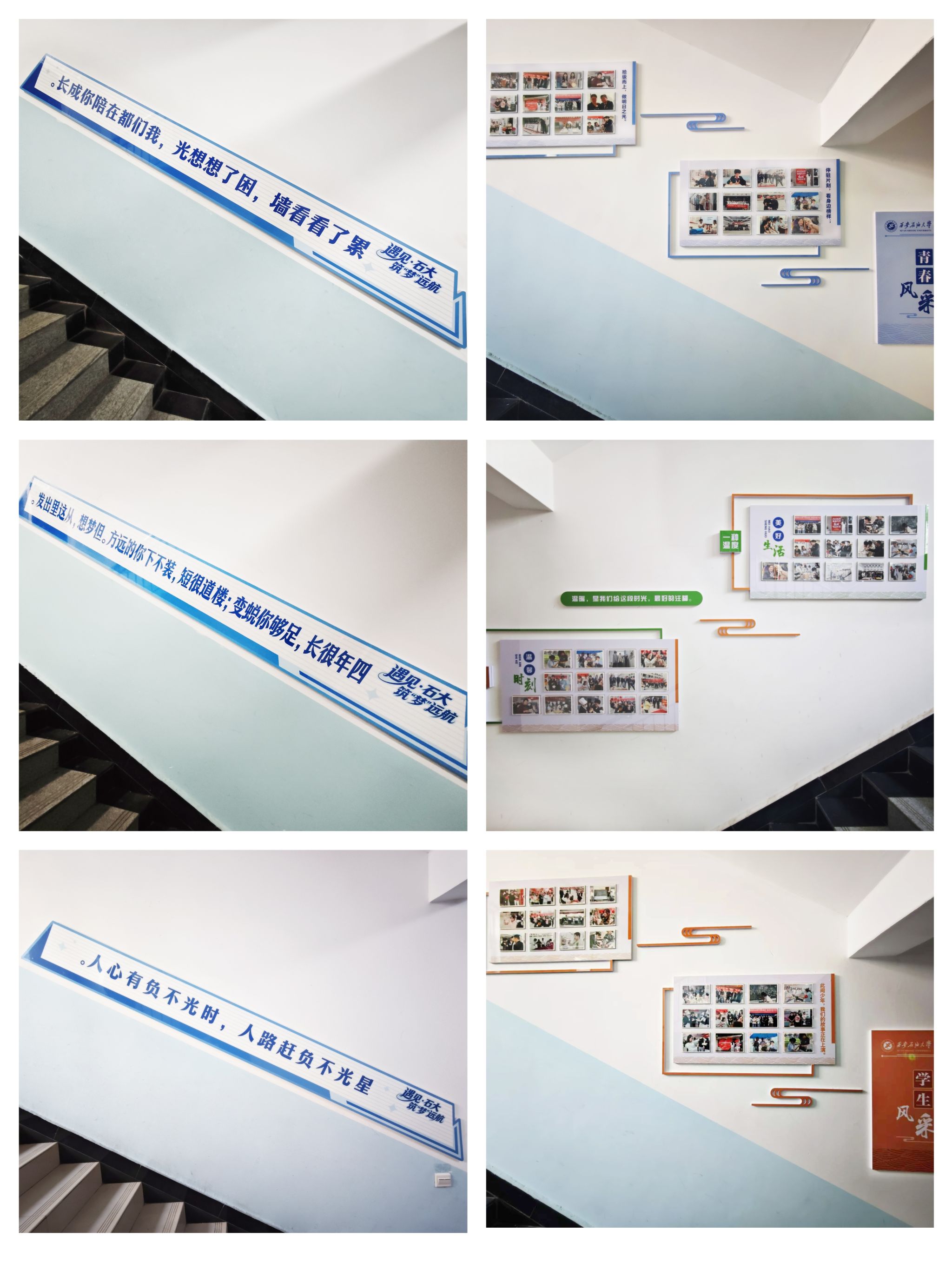 办学特色,将石油精神、青春理想与日常行为规范悄然融合,内容既有专业的厚度,也有情感的温度。“以油为墨绘山河,以钻为笔书青春”“怀揣石油报国志,勤学善思笃行之”……一句句饱含石油情怀的标语,不只是墙上的文字,更是青春的号角。当同学们走进公寓时,楼梯不再是匆匆而过的通道,而是可以驻足、共鸣、沉思的一道道风景,它们把专业使命与理想联结,激励着每一位同学在能源报国的浪潮中踏浪前行。