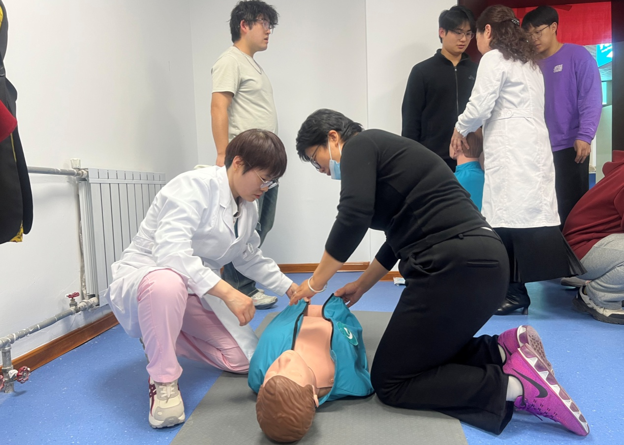 理论学习结束后,参训师生分组进入实操演练环节。在校医院急救团队手把手指导下,大家围绕心肺复苏、AED规范使用等内容反复练习。讲师逐一纠正按压姿势、发力方式、呼吸配合、电极片粘贴等细节,确保动作标准、流程规范。学员们认真投入、勤于实践,在沉浸式训练中熟练掌握急救要领,真正实现“听得懂、学得会、用得上”,为应对校园突发情况筑牢实战能力。