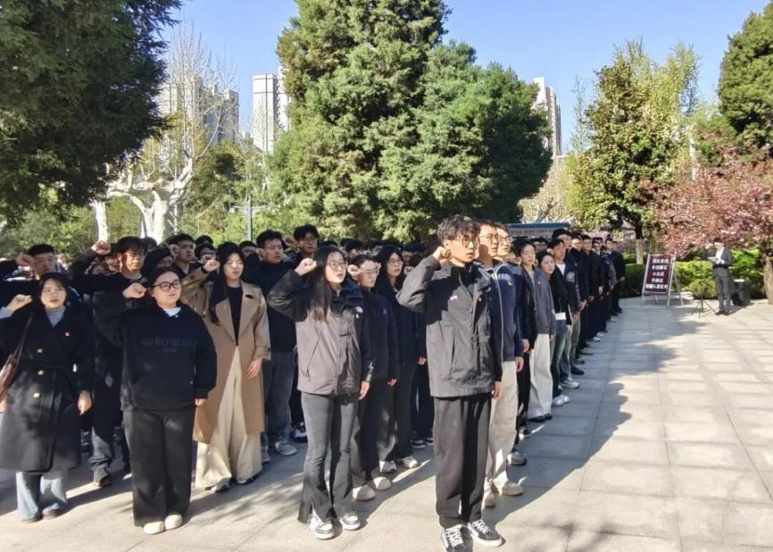 林世琦同学作为党员师生代表发言,他回顾了革命先辈们浴血奋战、无私奉献的峥嵘岁月,深刻阐述了传承英烈精神对新时代青年的重要意义。他结合青年学子身份,从坚定理想信念、勤学创新求索、践行社会主义核心价值观三方面,阐明了新时代青年传承英烈精神的行动方向,表达了青年一代勇担使命、为实现中华民族伟大复兴中国梦不懈奋斗的坚定决心。随后,全体师生党员面向鲜红党旗,高举右拳,重温入党誓词。铿锵有力的誓言回荡在陵园上空,彰显着党员们对党忠诚、为党的事业奋斗终身的初心。此次重温誓词,既是一次深刻的思想洗礼,也是一次精神淬炼,进一步坚定了全体党员的理想信念,激励大家不忘初心、勇担使命。