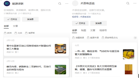 “术语有话说”“XSYU文思驿站”“能源译联”“华彩英绎”4个特色公众号平台