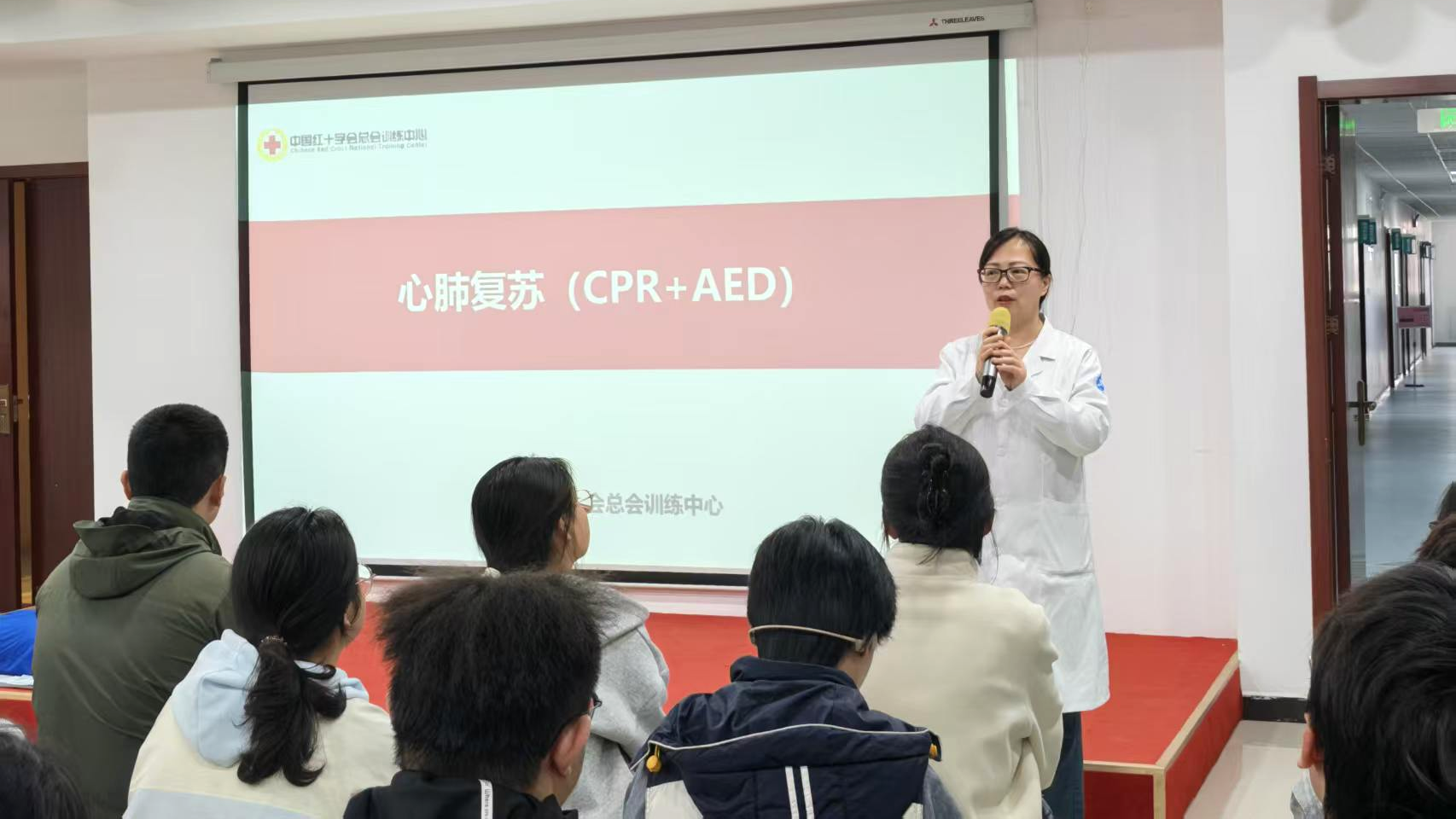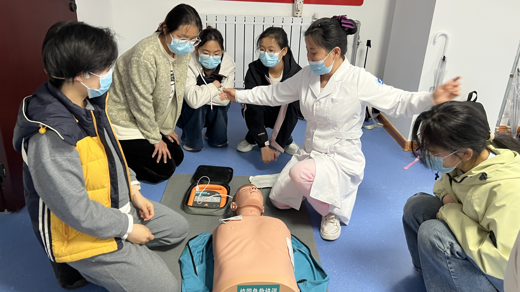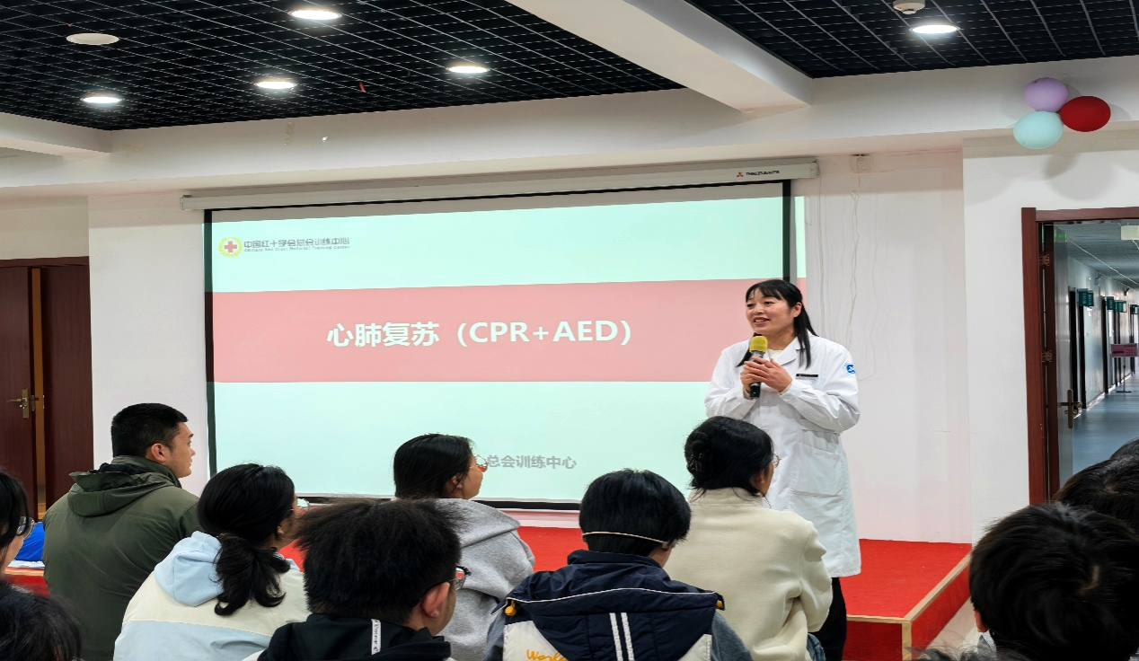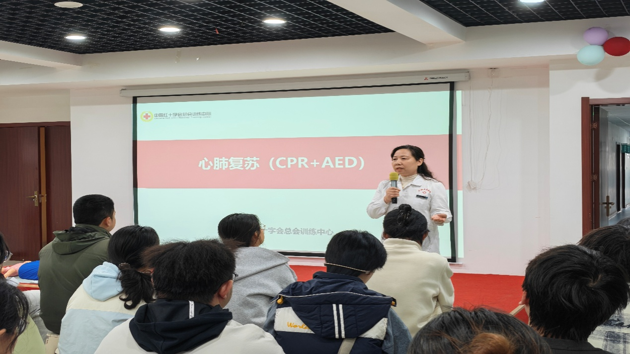 三个校区AED设备布设情况,让全体师生全面熟悉校园急救设施分布,为突发意外现场施救夯实硬件保障。同时她强调,校园人员密集,掌握专业急救技能是守护自身与他人生命安全的关键,勉励参训师生珍惜学习机会,认真学习、熟练掌握急救实操技能。