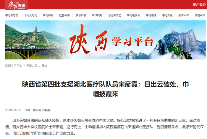 校医院的宋彦霞护士,逆行而上主动请缨加入陕西省第四批援鄂医疗队,到疫情最危急、最紧张的武汉去,用自己的所学所能为抗疫工作贡献力量。