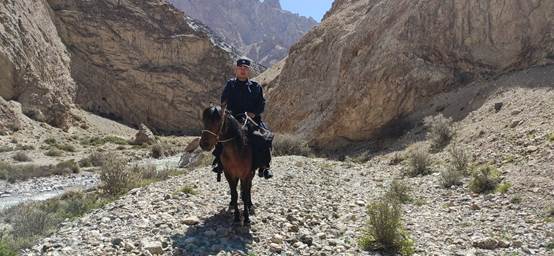 自2019年转改以来,崔帅帅始终坚守在工作岗位上,扎根在帕米尔雪域高原,作为一名汉族民警,为了搞好工作,加强沟通效果,他虚心向牧民群众学习维吾尔语,向所里的少数民族民警请教,努力提升少数民族语言沟通能力。为了解辖区基本情况,及时把党的路线、方针、政策和国家法律、法规传播到交通不便、消息闭塞的牧民群众当中,他经常到废寝忘食的地步去辖区开展法律宣传,4年里累计行程6000多公里,累计宣传党的政策方针1500余次,发放宣传单月4000余份,常常从最东边的牧民家跑到最西头的牧民家,每次都要和辖区群众进行亲切交谈,询问近期状况,给护边员交代巡逻任务。在派出所辖区,哪里有条小溪,哪儿有块什么样的石头,他都了如指掌,对于边境地区的地形地貌,气候变化,也如数家珍。他始终坚信“权力是人民给我们的,要为人民用好权”,要始终以朴实之风、坦诚之心去对待辖区群众。一身移民蓝,一双黑胶鞋,一年四季徒步在山路上。为了熟悉管区的每处情况,他经常带着馕和水就踏上了路途,遇到马和牦牛都难以行走的地方,他就自己背着东西,一步一步走过去。有人和崔帅帅开玩笑说他把边境线上的石头都压碎了。风里来,雨里去,日复一日地深入边境一线牧民居住点进行治安调查,扎实开展“扫黑除恶”“惊雷一号”“我为群众办实事”等专项活动,确保辖区的和谐稳定。