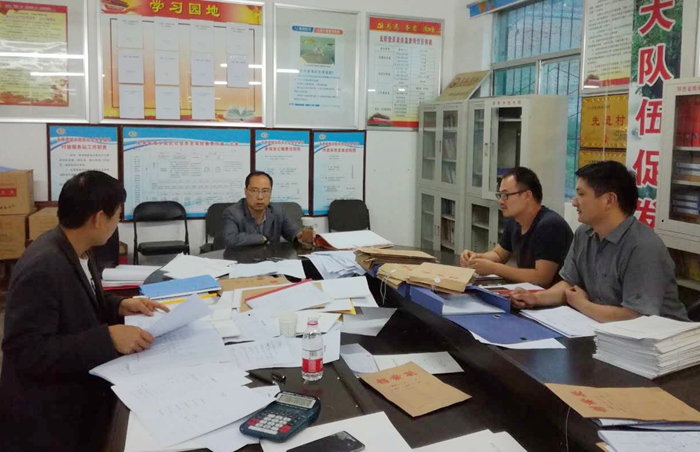 侯阳(右二)在坚固村整理精准帮扶台账