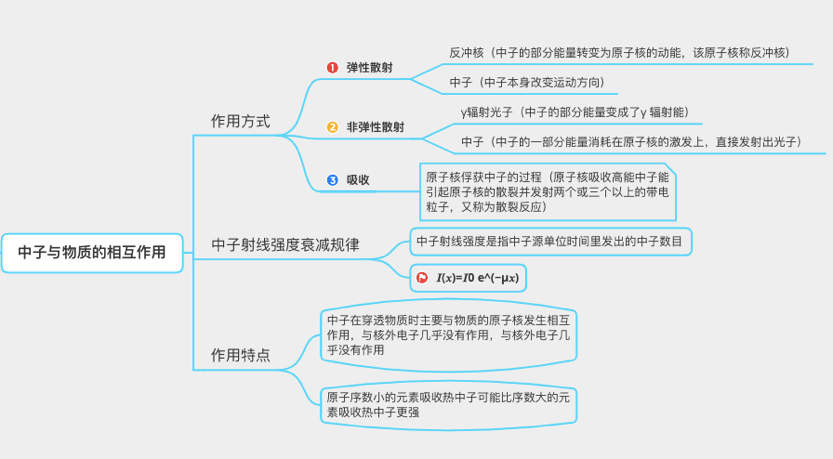 在特殊的教学环境下,如何得到学生学习成果的及时反馈尤为重要。在线上授课过程中,吕老师结合思维导图教学理念,利用层级折叠式文字来整理内容的大纲文档工具,使学生用更高效的方式和更清晰的结构来记录学习笔记,在授课过程中采用Xmind等工具生成教学及学习思维导图。思维导图学习法是在西方中小学教学中常见的一种学习策略,也被公认为认知与学习、反思与创新的工具,利用思维导图的可视化,促进学习者灵感的产生和发散性思维的形成,在国外教育领域也广泛作为优化思维的工具,对教师的教和学生的学都有很大帮助。吕老师在日本攻读博士学位期间,接受到“思维导图”这一学习工具的教育和启发,将此学习法渗透到教学设计中,并在教学过程中引导学生对绘制思维导图学习方法进行研究和探索。疫情之下的线上教学中部分学生面临没有教材,在课堂上需要通过记录听课笔记的方式进行学习,吕老师引导学生在进行课堂内容消化吸收过程中采用思维导图学习法进行手绘或者利用思维导图app进行整理归纳知识点,将每一堂课的内容进行关键概念和信息的整合,调动全脑配合,根据个人的理解水平,连接关键词充分记录自己的思考和理解过程绘制课程思维导图。一张图画,胜过千言万语,吕老师通过学生提交的思维导图可以得到学生对课程的理解掌握程度,一方面在对课堂内容学习的过程中提升学生的归纳总结能力,将思维方式进行可视化表达。另一方面可以反馈学生对授课内容重难点的理解掌握程度,以便进行教学方式进度的改进。以课程《无损检测CIVA仿真技术》为例,在仿真技术学习之前,学生对射线与物质的相互作用绘制思维导图如下图,以中子与物质的相互作用为中心主题,向外发散辐射与中心主题相关的结构和节点,用链接的方式来调动学生思考中心主题中子与物质的相互作用辐射出三个相关概念(作用方式、中子射线强度衰减规律、作用特点)。再以三个概念辐射出每一部分包含的内容,以此类推得到中子与物质的相互作用这一章节内容的整体框架和逻辑。帮助学生发散思维、记忆和提高思考深度广度,建立各种概念和知识点之间的层级联系。