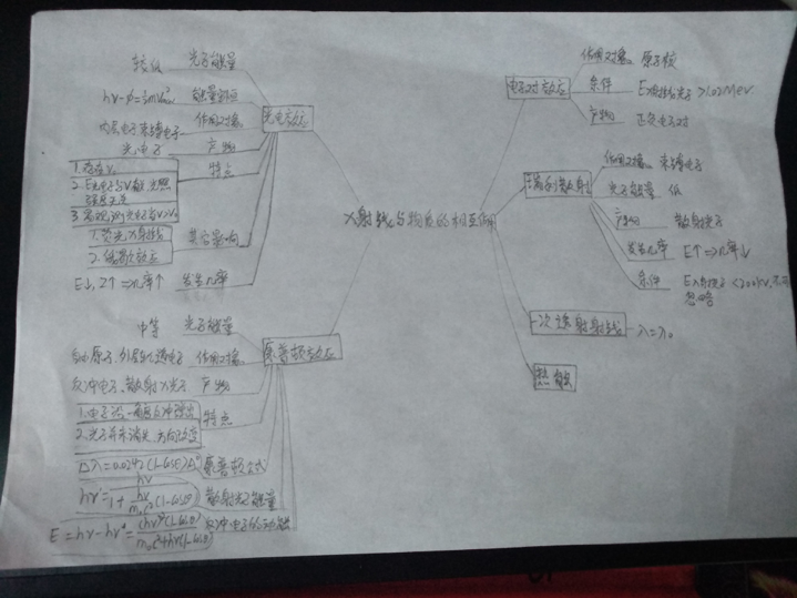 另外,学生也可以自由发挥手绘思维导图。自古以来,从远古时代的象形文字与符号,到中国古代周易八卦图,以及近现代的路标、地图、插图等等,都可以帮助我们去理解新知识。图无处不在,在学习过程中,通过引导学生以图代替文字语言侧重逻辑表达,使得学习过程具有丰富的内涵和更加直观的学习效果,也让学生对自己的学习内容和思维方式的认知过程更加形象化,得到自己形象化思维结果的同时也收获到成就感。吕老师在《无损检测CIVA仿真技术》教学过程中,鼓励学生尝试手绘思维导图,如下图所示:以X射线与物质的相互作用为中心主题辐射出这部分课程所包含的内容,但是从绘制得到的思维导图可以看出该学生对X射线与物质的作用方式与作用产物的逻辑理解上存在一定的差池,在下一次教学过程中将进行强调指出并调整教学计划。为了让学生提高自我学习意识,吕老师在授课过程中还鼓励学生自由探索,让学生进行自我选择绘制思维导图软件,并且进行相互讨论分享,如何利用网络资源进一步提高对课程知识点的有效学习和梳理。在传授知识的同时,吕老师传递给学生的还有善于思考的研学精神。